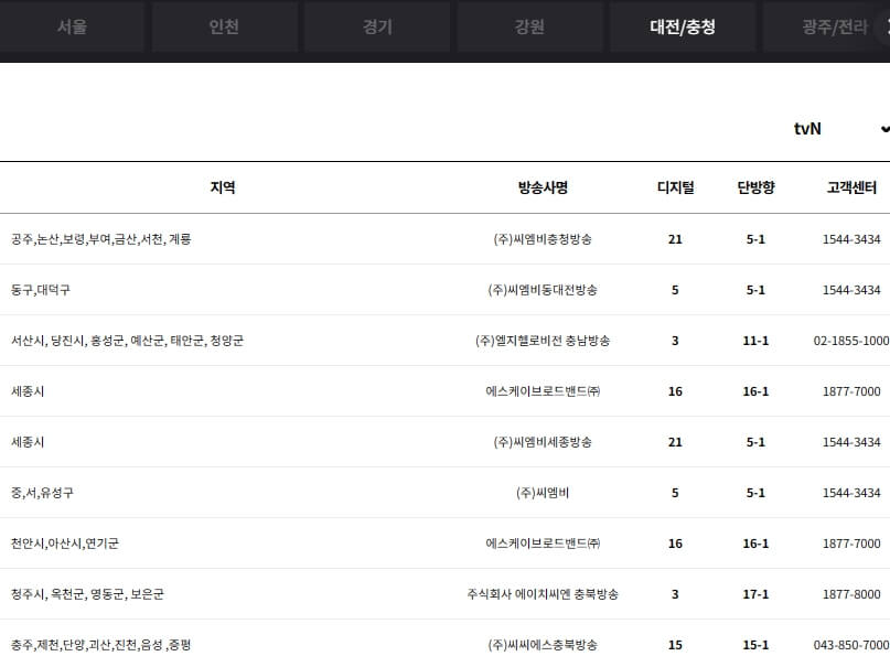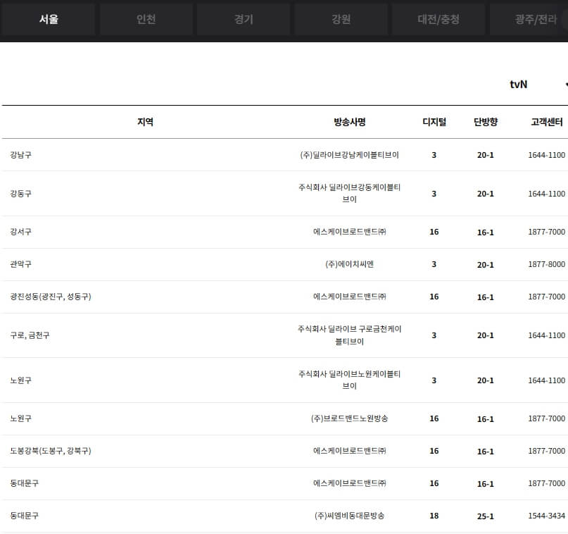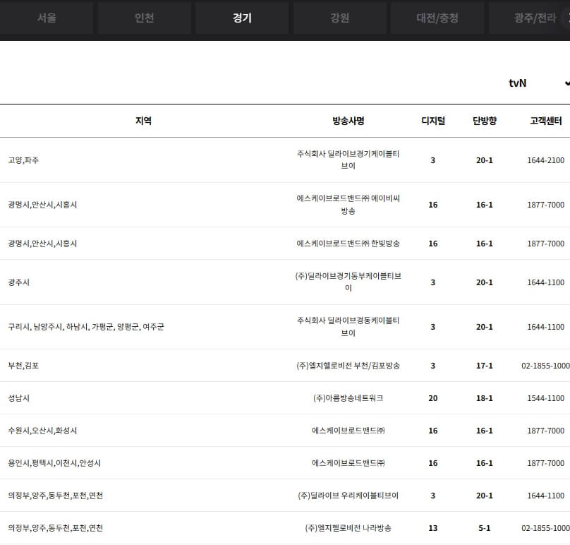 아래에서 딜라이브, HCN, JCN, 서경방송, KCTV, 금강방송, 푸른방송, CMB, 남인천방송, 엘지헬로비전(헬로 TV), 아름방송 등의 지역별 채널번호와 고객센터 번호를 확인하실 수 있습니다.
