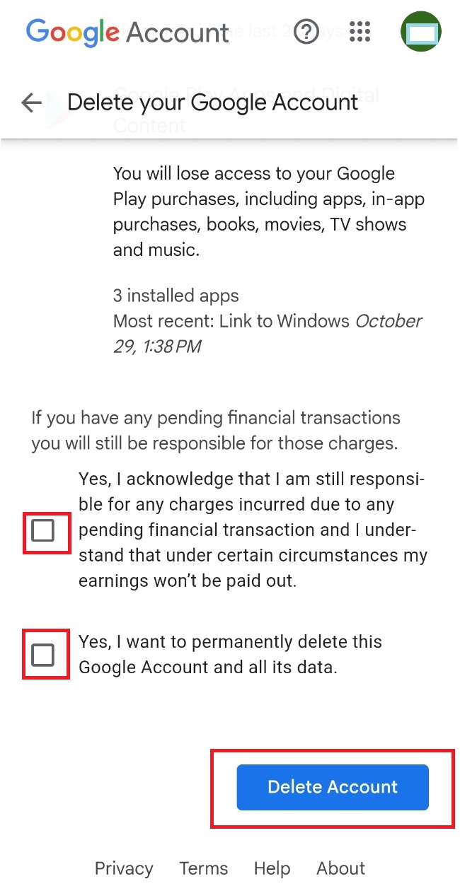 6) 계정 삭제로 인한 금전적인 문제 등에 대해 본인의 책임이며, 계정 영구 삭제에 동의한다는 체크박스에 모두 체크하고 'Delete Account (계정 삭제)'를 클릭하면 계정 삭제가 완료됩니다.