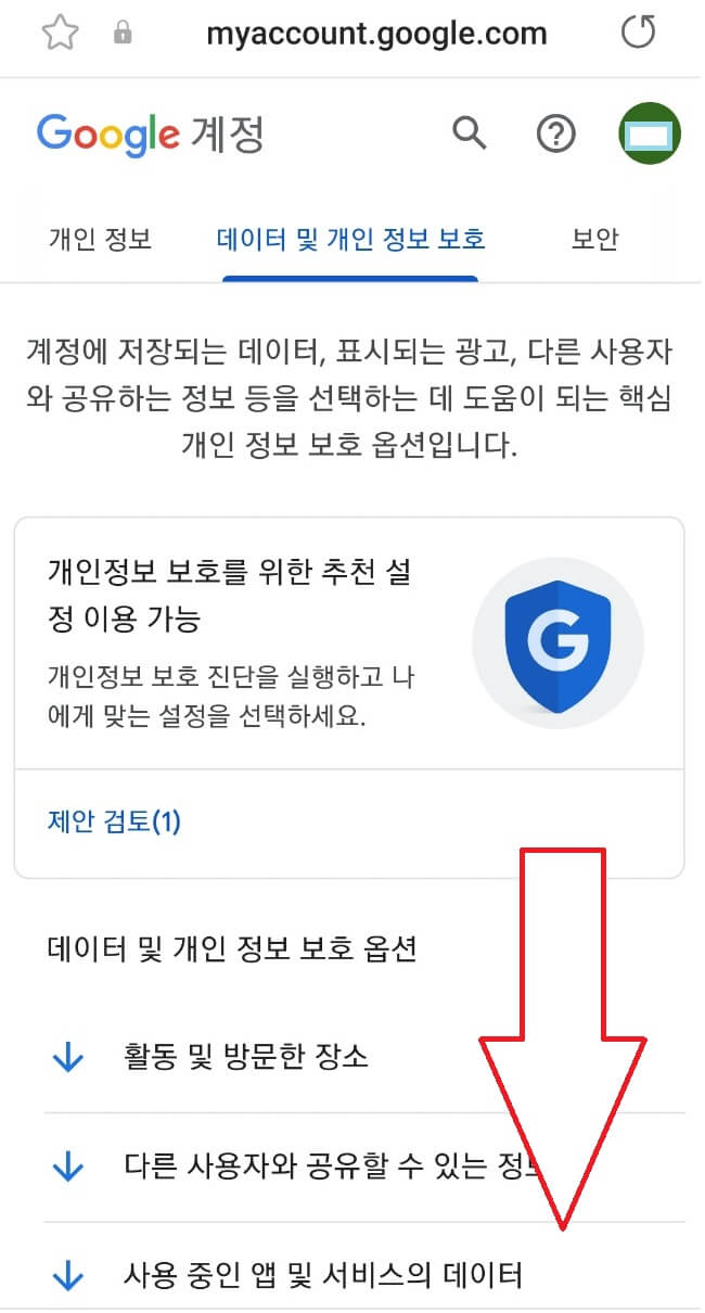 3) '데이터 및 개인 정보 보호'를 클릭합니다.