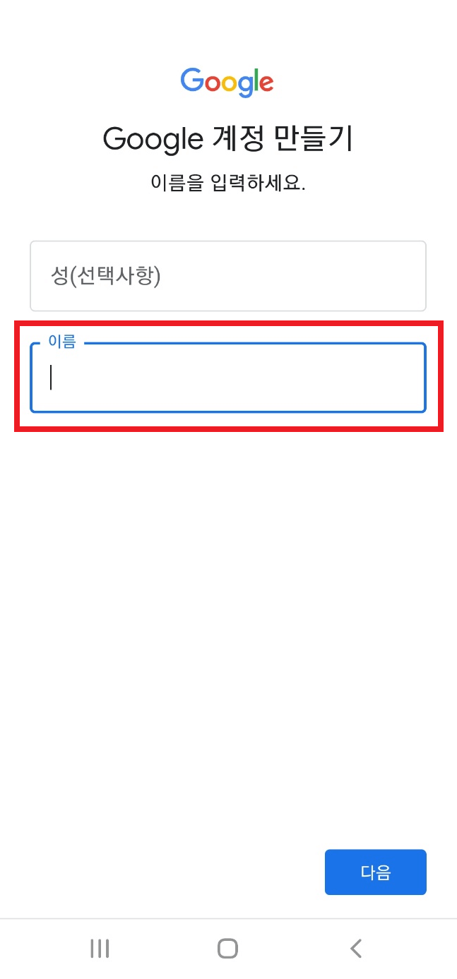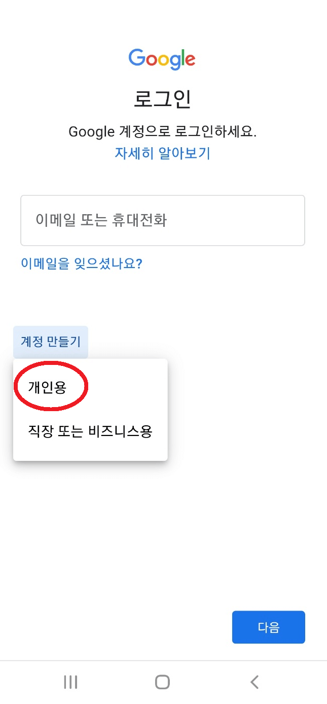 3. 다음 화면에서 '계정만들기'를 클릭하고 '개인용'을 선택합니다. 이름은 한글이나 영문 둘 다 가능합니다. 성은 선택사항이고 이름은 아무거나 입력해도 됩니다.