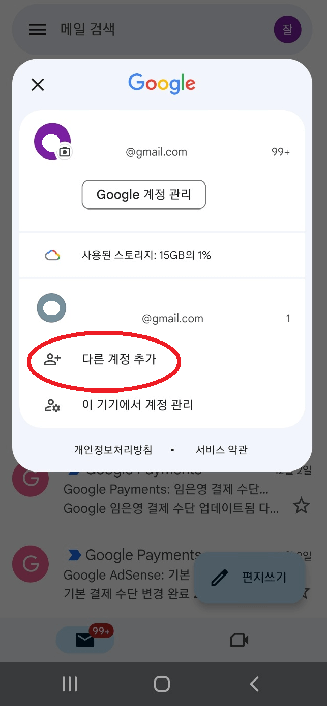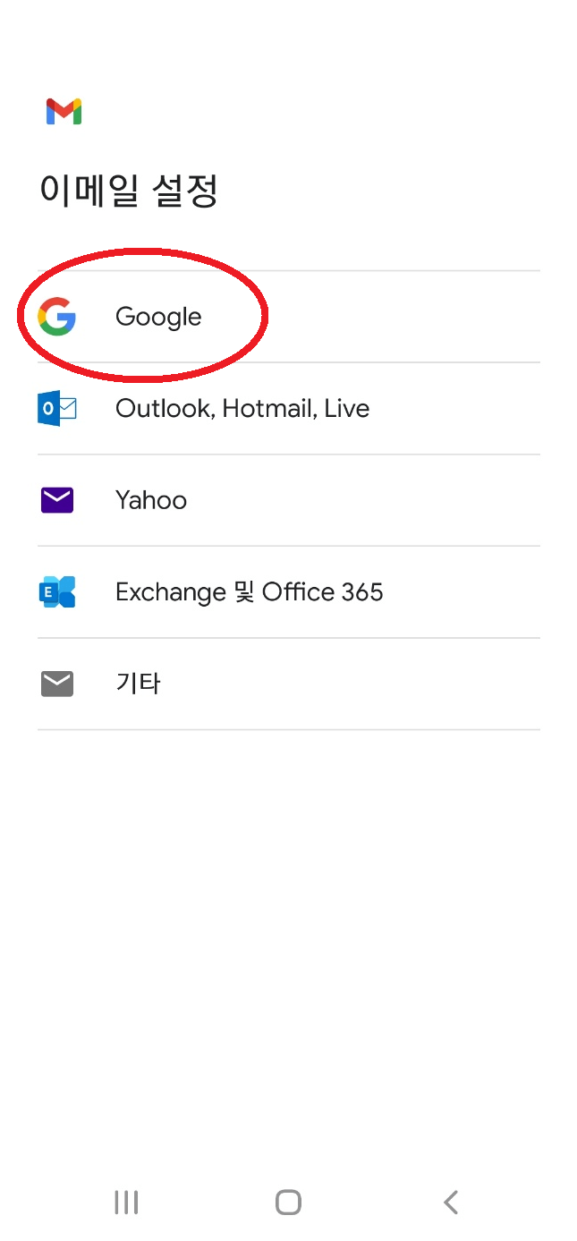 2. 메일 오른쪽 상단 모서리에 보이는 이미 가지고 있는 계정의 파비콘을 누릅니다. 그리고 '다른 계정 추가'를 클릭 후 이메일 설정에서 'Google'을 선택합니다.