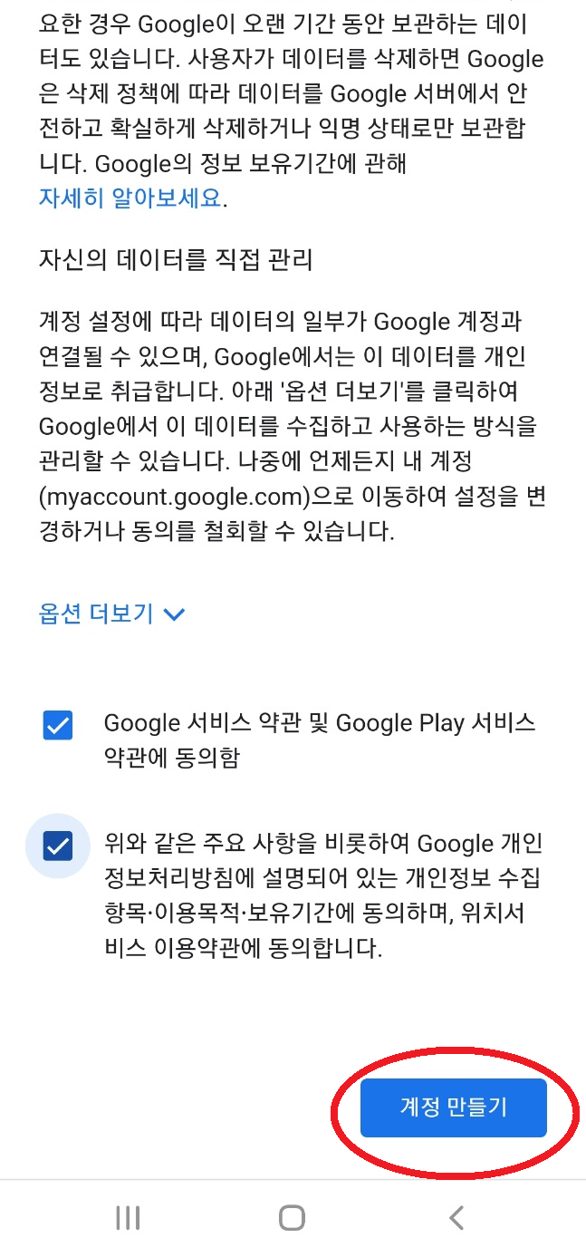6. 구글 서비스 약관에 모두 동의하고 '계정 만들기'를 클릭합니다. 그럼 계정 만들기가 모두 끝납니다. 오른쪽 상단의 파비콘을 눌러보시면 계정이 하나 더 생긴 것을 확인하실 수 있습니다.