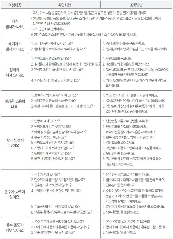 AS 신청 전, 에러코드와 별개로 아래의 보일러 이상 증상별 확인해야 할 사항과 처리방법을 확인해 보시기 바랍니다. 의외로 간단하게 문제가 해결되거나 화재나 폭발 등 큰 문제가 발생하기 전 미리 예방할 수 있습니다. 사진을 누르면 크게 보실 수 있습니다.