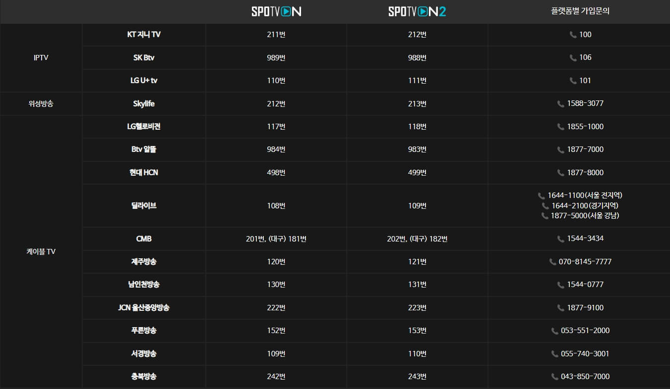 스포티비 채널번호와 가입문의 번호는 아래와 같습니다. 사진을 누르시면 크게 보실 수 있습니다.