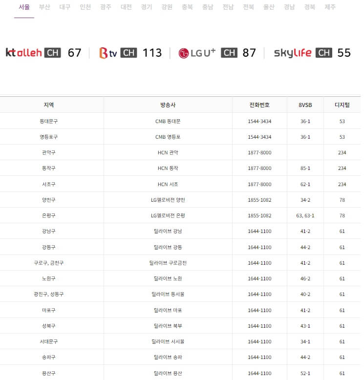 ✅ 지역 케이블 방송사별 채널번호