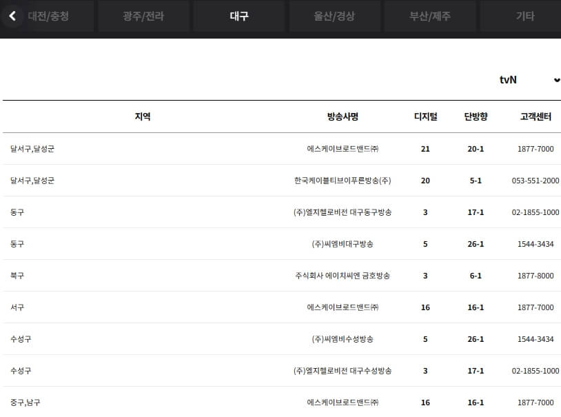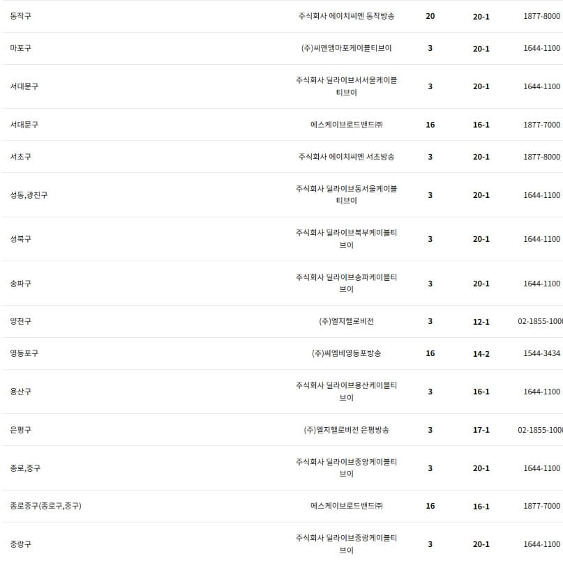 아래에서 딜라이브, HCN, JCN, 서경방송, KCTV, 금강방송, 푸른방송, CMB, 남인천방송, 엘지헬로비전(헬로 TV), 아름방송 등의 지역별 채널번호와 고객센터 번호를 확인하실 수 있습니다.
